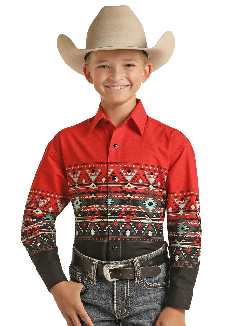 Panhandle Boy’s Black & Red Aztec Border Snap Long Sleeve