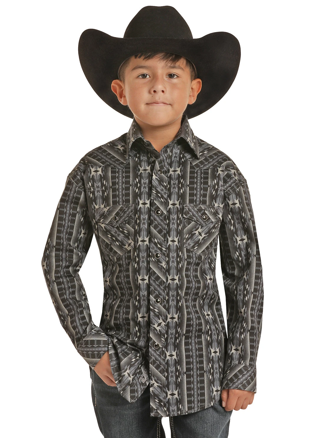 Charcoal All Over Aztec Print Long Sleeve Snap Front Shirt.