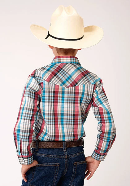 Cream, Turquoise, Red and Black Plaid Long Sleeve Snap Front Shirt.