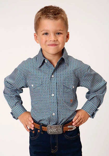 Blue Geometric Print Long Sleeve Snap Front Shirt.