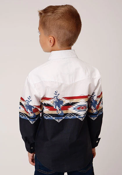 Black and White Aztec Rider Border Print Long Sleeve Snap Front Shirt.