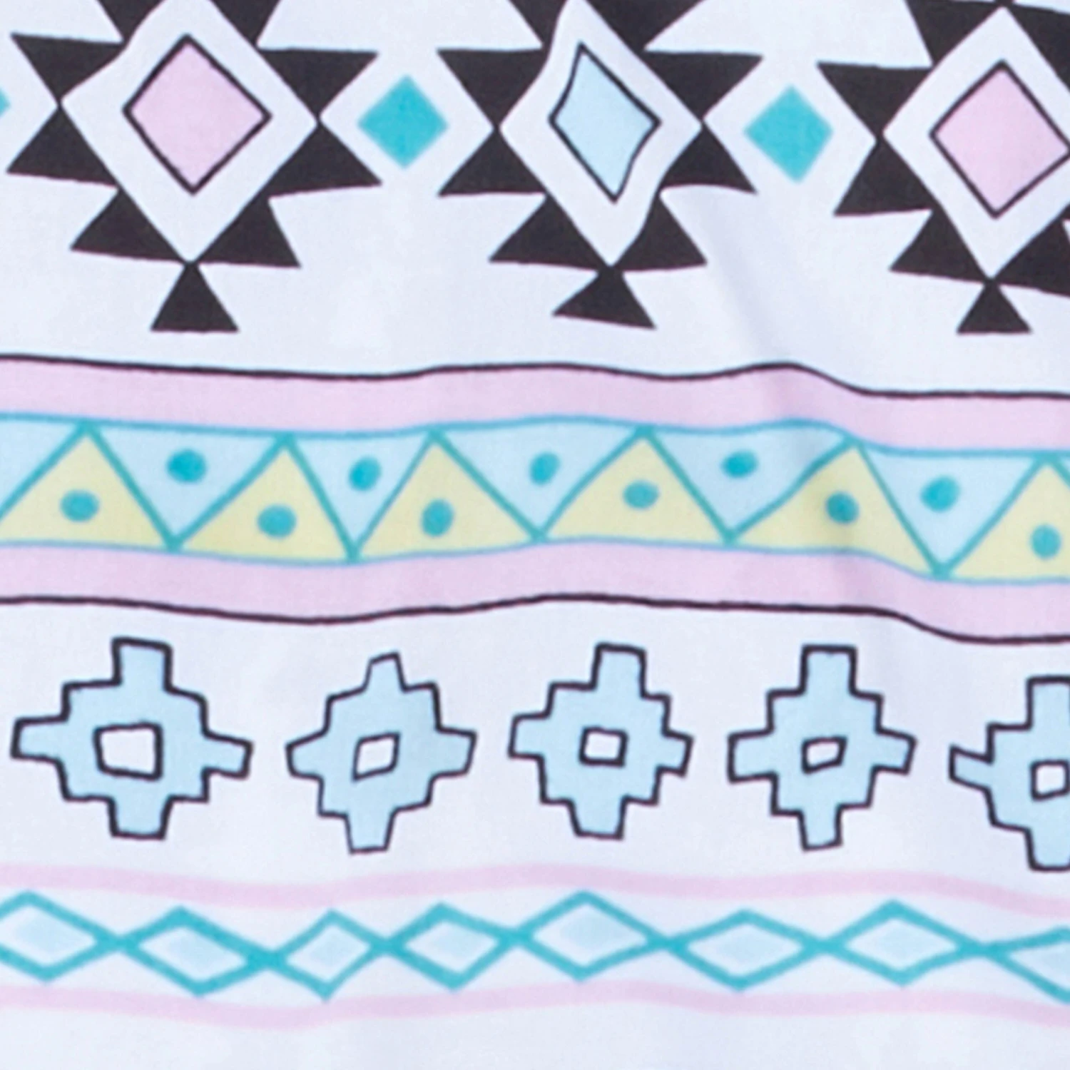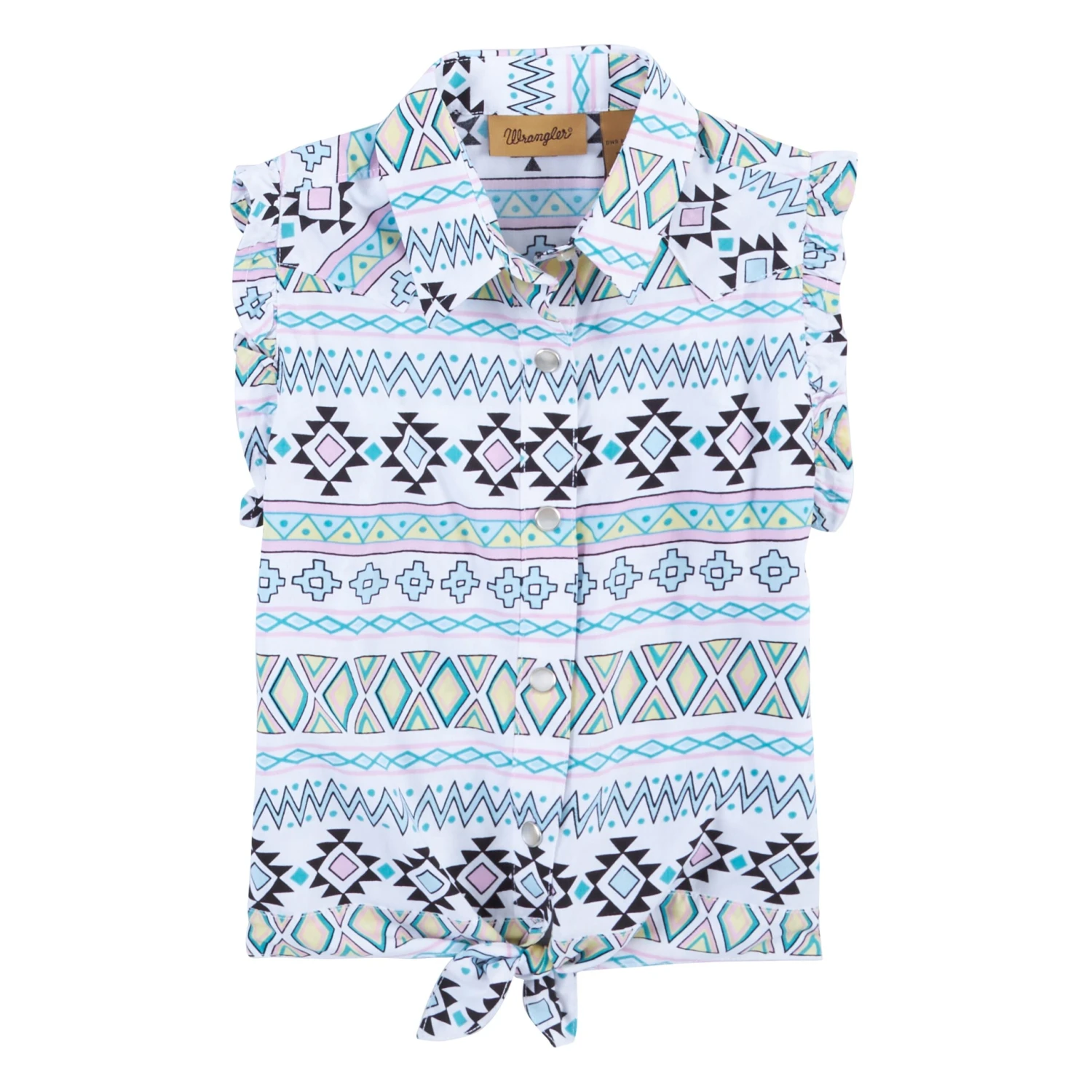 White with Multi Color Aztec Print Sleeveless Snap Front Shirt.